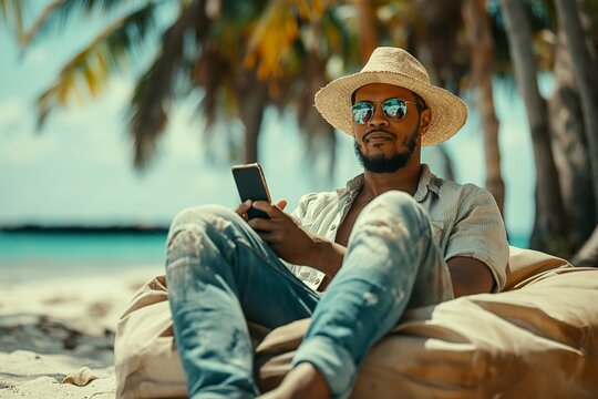 Young man on vacation on the beach, relaxing and using a smartphone.