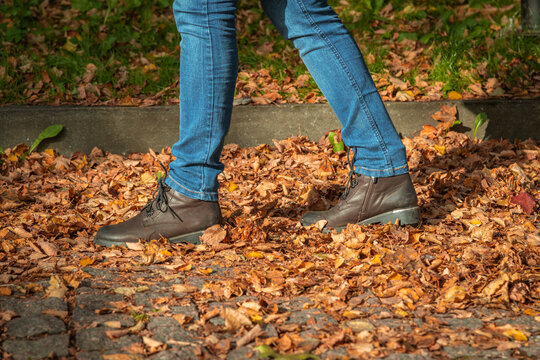 Close up view of woman walking on fallen orange leaves lying on paving stones of avenue in public park. Selective focus. Abstract autumn background.