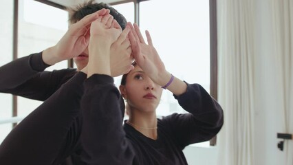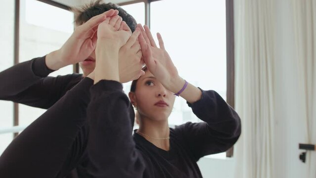 Young inspired couple of contemporary dancers practicing lyrical dance in a studio during rehearsal. Medium handheld shot