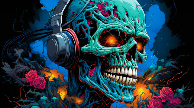 Patterned background with multiple skulls and floral designs in a vintage gothic style aesthetic