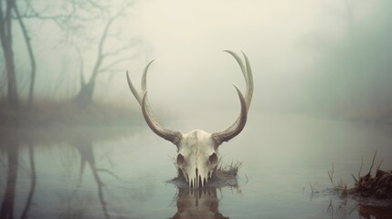 Creepy looking old buffalo skull with long horns that died in dirty murky water swamp, eerie mist of death and rotting decay hangs in air - generative AI