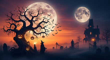 Spooky Halloween graveyard scene with a haunted house and glowing jack-o'-lanterns under a full moon
