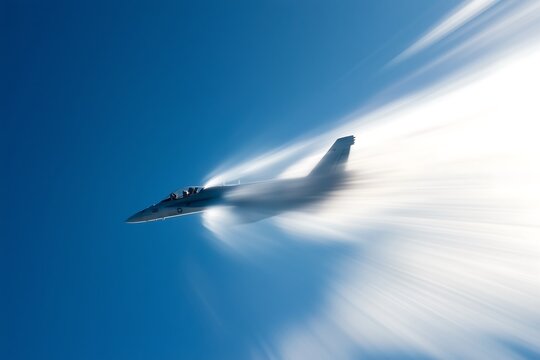 Jet fighter plane breaking sound barrier, creating dramatic vapor cone in blue sky