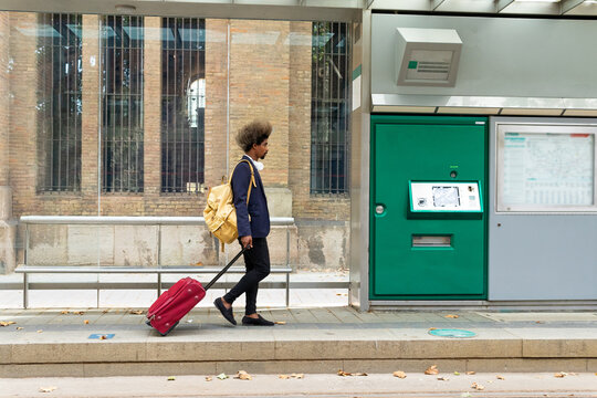 Side view of black man with afro hair walking on a tram station with a suitcase on wheels and a bag hanging from his shoulder