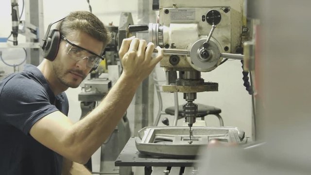 Male Apprentice Engineer Working On Drill In Factory