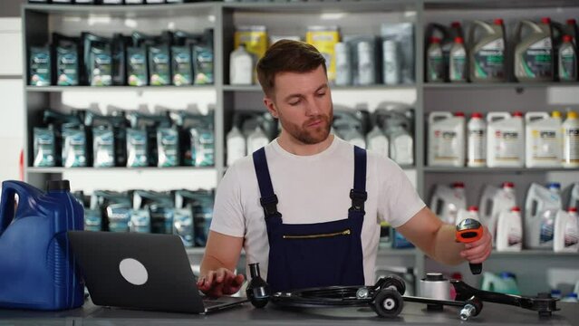 Auto parts seller standing at counter checking car parts and making notes in laptop
