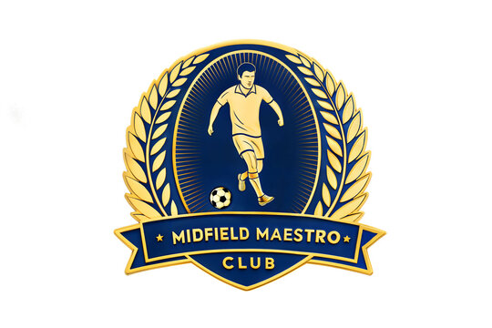 Midfield Maestro Club Badge – Soccer Emblem with Laurel Wreath, Player Dribbling, Gold Banner, Classic Illustration logo