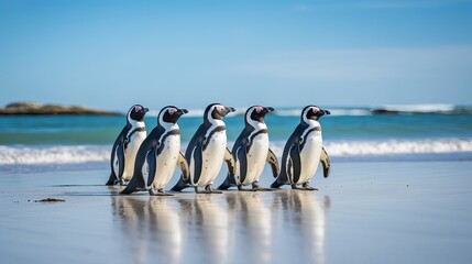 Group of Magellanic penguins resting on a sandy beach. South Africa.