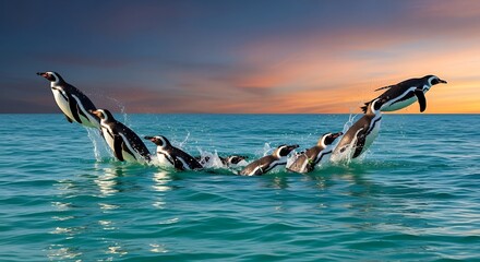 a breathtaking view of magellanic penguins leaping and splashing out of the vibrant turquoise ocean at sunset displaying unique behavior high quality professional