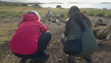 Two women taking photos of group of penguins. Tourists looking at a colony of penguins. Magellanic penguins nest.