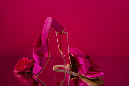 Stylish woman in magenta color jacket and heart shaped sunglasses wearing wireless headphones on her head and listening music. Urban city street fashion. Color of the 2023 year. Selective focus.