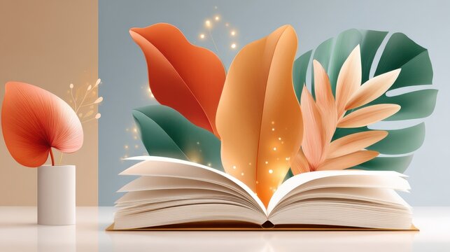 Magical glowing leaves sprouting from an open book in a serene scene
