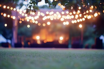 Outdoor event space at twilight is illuminated with string lights hanging from the trees. The stage lights are glowing in the background