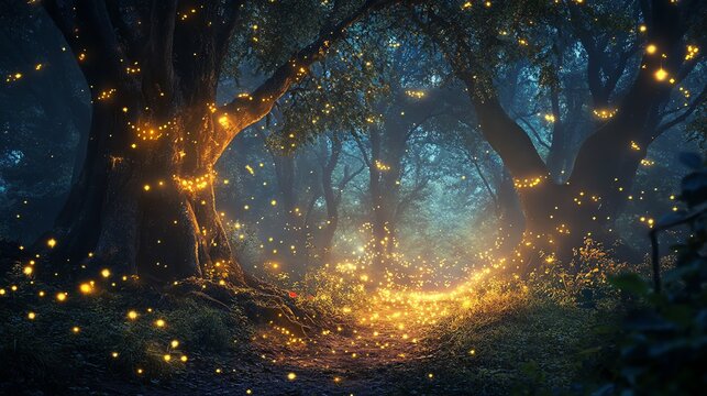 The stock photo showcases a magical forest illuminated by glowing fireflies and surrounded by ancient trees.
