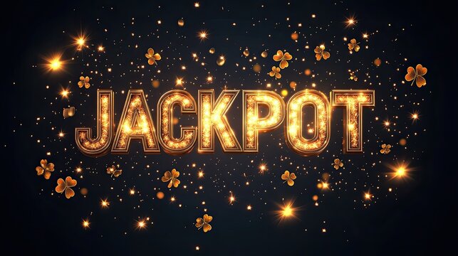 Sparkling golden jackpot letters with falling stars and four-leaf clovers on a dark navy background create a magical atmosphere of fortune