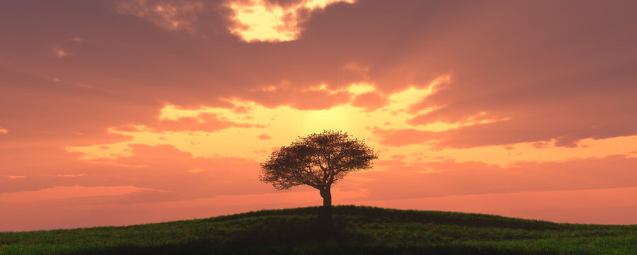 A magical winter sunrise illuminates a snow-covered tree and landscape, creating a serene and picturesque scene with warm golden light and sparkling bokeh.