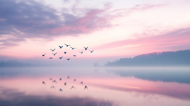 Birds in flight over a serene lake as a flock magically creates graceful aerial artistry