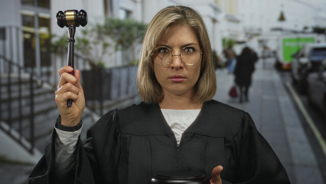 Serious woman judge in black robe holds wooden gavel aloft on bustling city street with stern expression; justice.