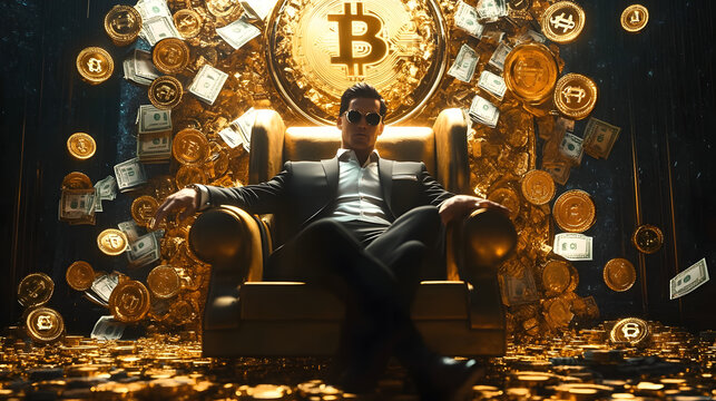 opulent tycoon surrounded by cash and cryptocurrency golden wealth display