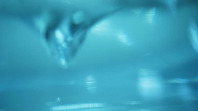 Magnetic mixer stirrers with fast moving stir bar for mixing liquid at medical factory, exhibition, trade show: close up. Chemistry, science, pharmaceutical, laboratory equipment concept