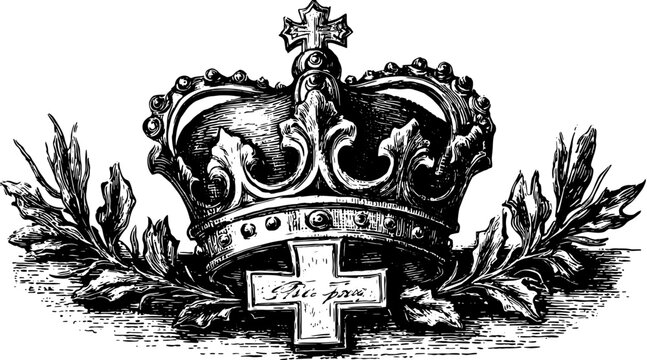 Christian cross integrated with a royal crown design. Vintage vector illustration featuring intricate floral elements in a detailed set.