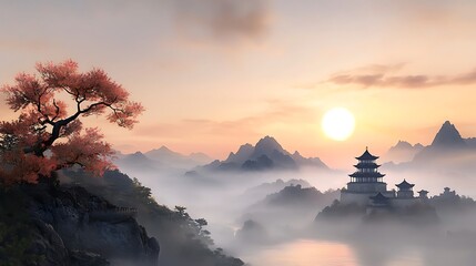 A vast and magnificent landscape stretching for miles, with majestic mountains and winding rivers, distant towering city walls with nine gates, decorated with golden studs and red lacquer, bathed