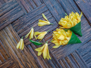 Magnolia Champaca flower,Champak or Michelia champaca lay on wooden background.