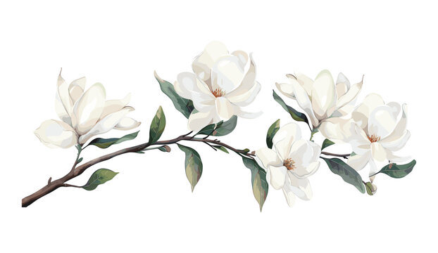 Vector illustration of magnolia tree branch with cream white flowers, green leaves, watercolor style, spring design, elegant floral element, invite card template, isolated botanical artwork