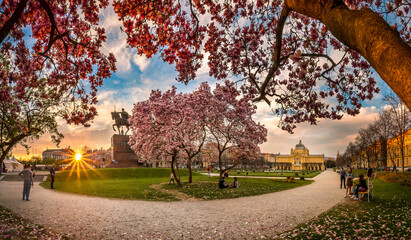 Zagreb, Croatia - 30 November 2016: Panoramic view of Tomislav Park with magnolia blossom at sunset, in Croatia.