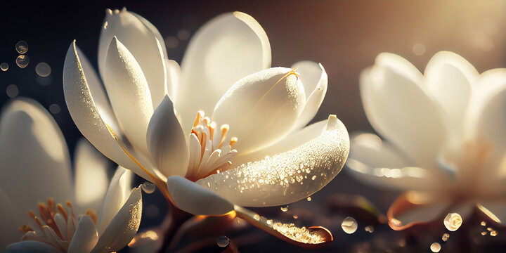 Close art of magical beautiful blooming magnolia flowers with fantasy colors, macro and magic light