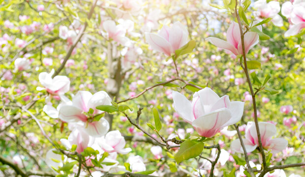 Magnolia flowers with elegant petals blooming in spring fabulous green garden, mysterious fairy tale springtime floral sunny background with magnoliaceae bloom, beautiful nature park landscape.