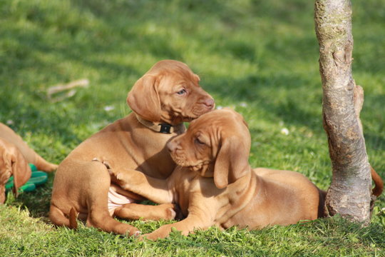 Magyar Vizsla, Hungarian Short-Haired Pointing Dog, puppy, running on meadow