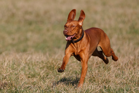 Young magyar vizsla dog puppy rages across the meadow and is photographed in flight