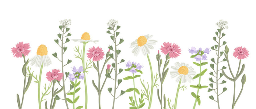 wild chamomiles, maiden pink and shepherd's purse, field flowers, vector drawing plants at white background, floral elements, hand drawn botanical illustration