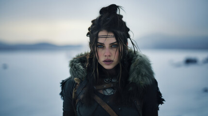 portrait of a viking shield maiden with a wolf guide - Created with generative AI technology