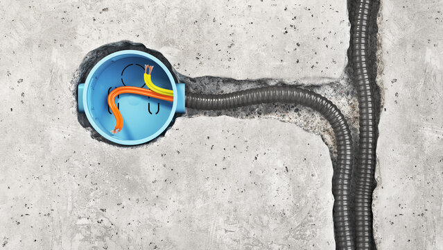Unfinished electrical mains outlet socket with electrical wires. 3d illustration