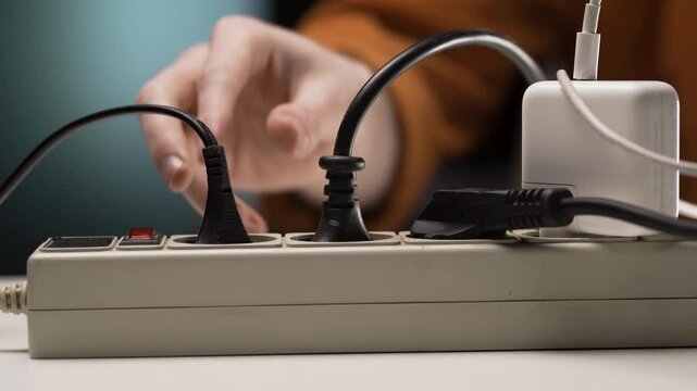 Male hand unplugging power plug. Electrical plug in outlet socket