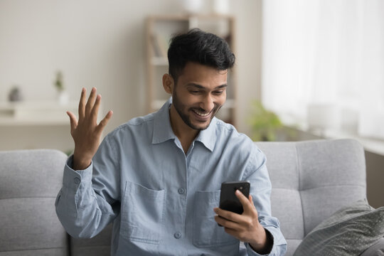 Portrait of happy Hindu man with curly hair smile toothily keeps arms down dressed in casual t shirt looks cheerful isolated over brown background being in good mood. Human positive emotions concept