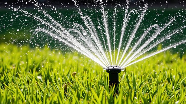 Lawn sprinkler waters lush green grass. Crystal droplets spray outwards, creating a refreshing and vibrant scene, promoting growth.