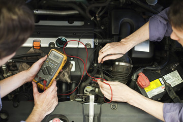 Automotive mechanic repairmen checking the system working engine of the engine room, check the mileage of the car, oil change, auto maintenance service concept.