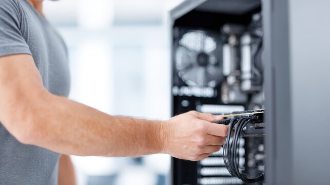 Male technician performing maintenance on a computer, connecting cables inside a desktop tower, showcasing technical skills and attention to detail in a modern workspace