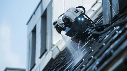 Detailed capture of a robotic worker servicing a house roof with a pressure washer, emphasizing modern solutions for home maintenance