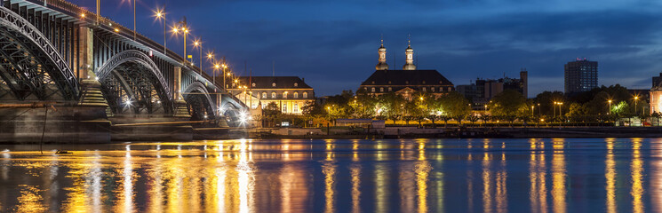 Beautiful sunset night over Rhine / Rhein river and old bridge in Mainz near Frankfurt am Main, Germany.