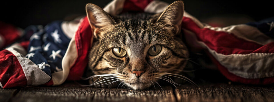 A majestic cat gazes solemnly from beneath the American flag, encapsulating the dignified spirit of July 4th, America's day of independence.