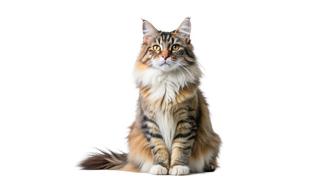 "Majestic Meow": A majestic cat sitting tall and proud, its eyes gazing into the distance with an air of regal authority against the pure white background.
