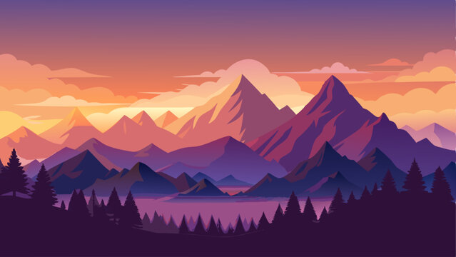 Colorful sunset over mountains and tranquil lake in a serene landscape with pine trees