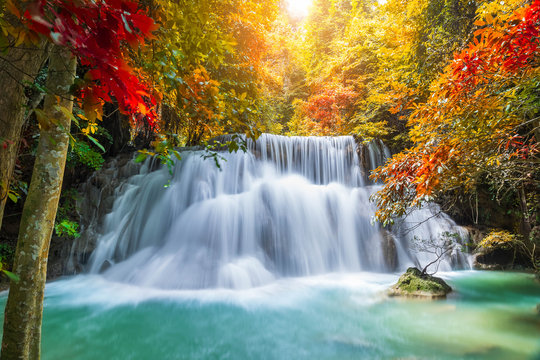 Sunlit waterfall cascading into tranquil pool in lush jungle.