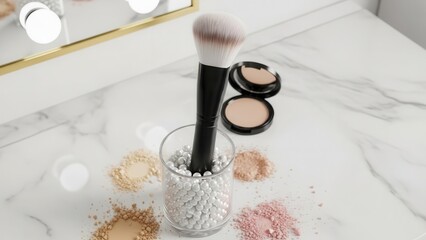 Elegant and pristine makeup artistry setup featuring a soft, black-handled brush standing upright in a clear glass filled with shimmering white pearls, alongside two compacts of powder foundation,