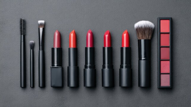 Collection of various lipsticks and makeup brushes arranged neatly on a textured surface, showcasing vibrant colors and professional makeup artistry for beauty enthusiasts