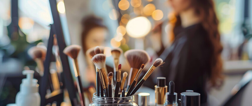Soft pink and silver makeup brushes arranged elegantly against a shimmering background